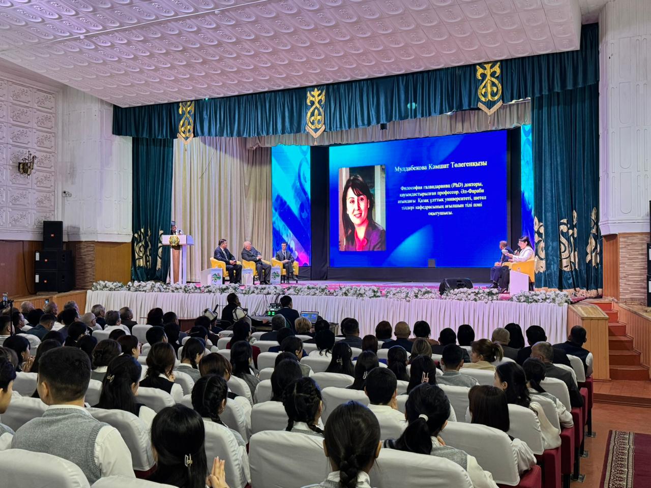 Аким района Бота Елеусизова в своей приветственной речи отметила неоценимый вклад учителей и ученых в развитие страны.