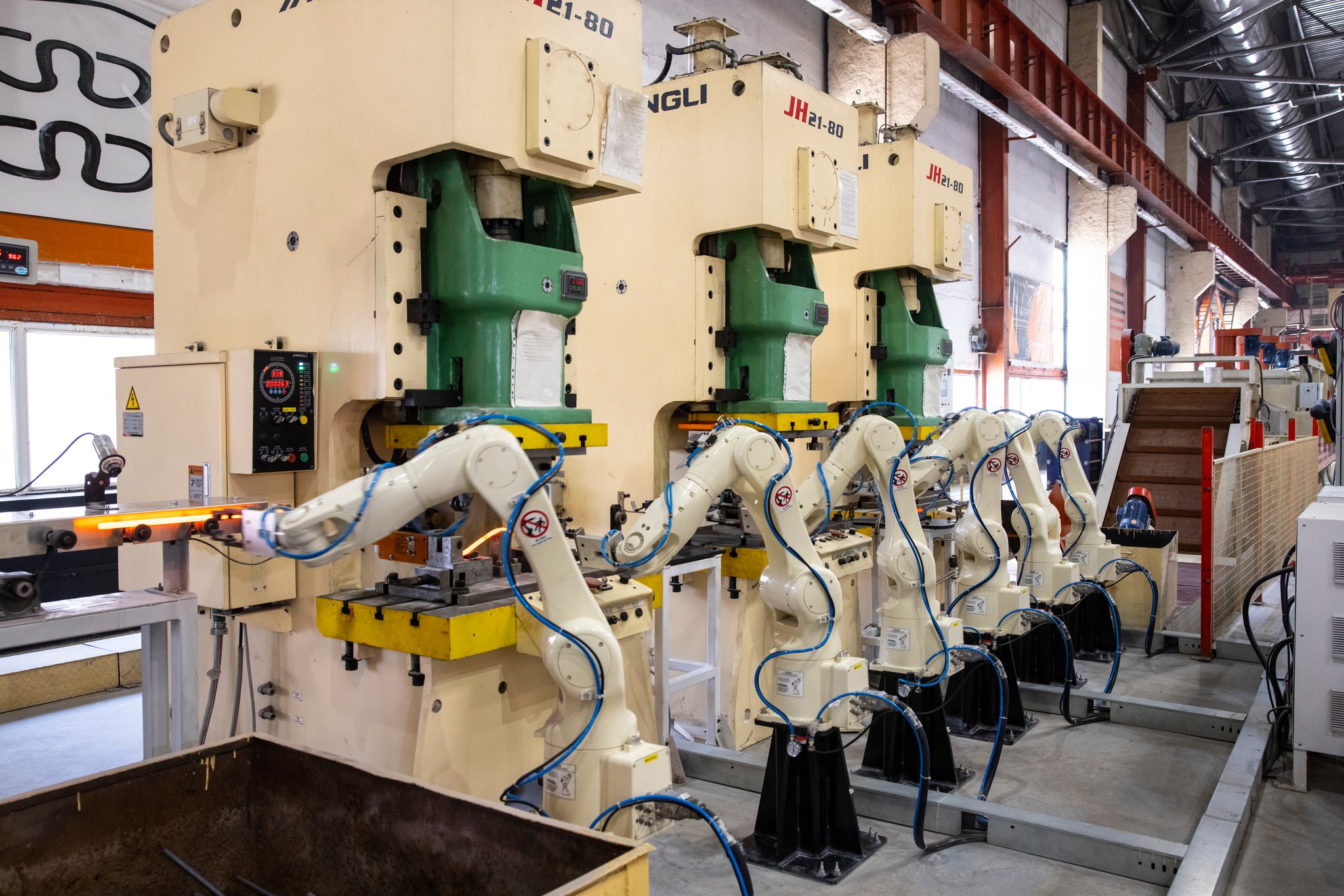 Финальной точкой пресс-тура стало производство полного комплекта рельсовых скреплений - трех полимерных и двух металлических деталей. На одном из участков работают промышленные роботы, изготавливающие упругие стальные клеммы.