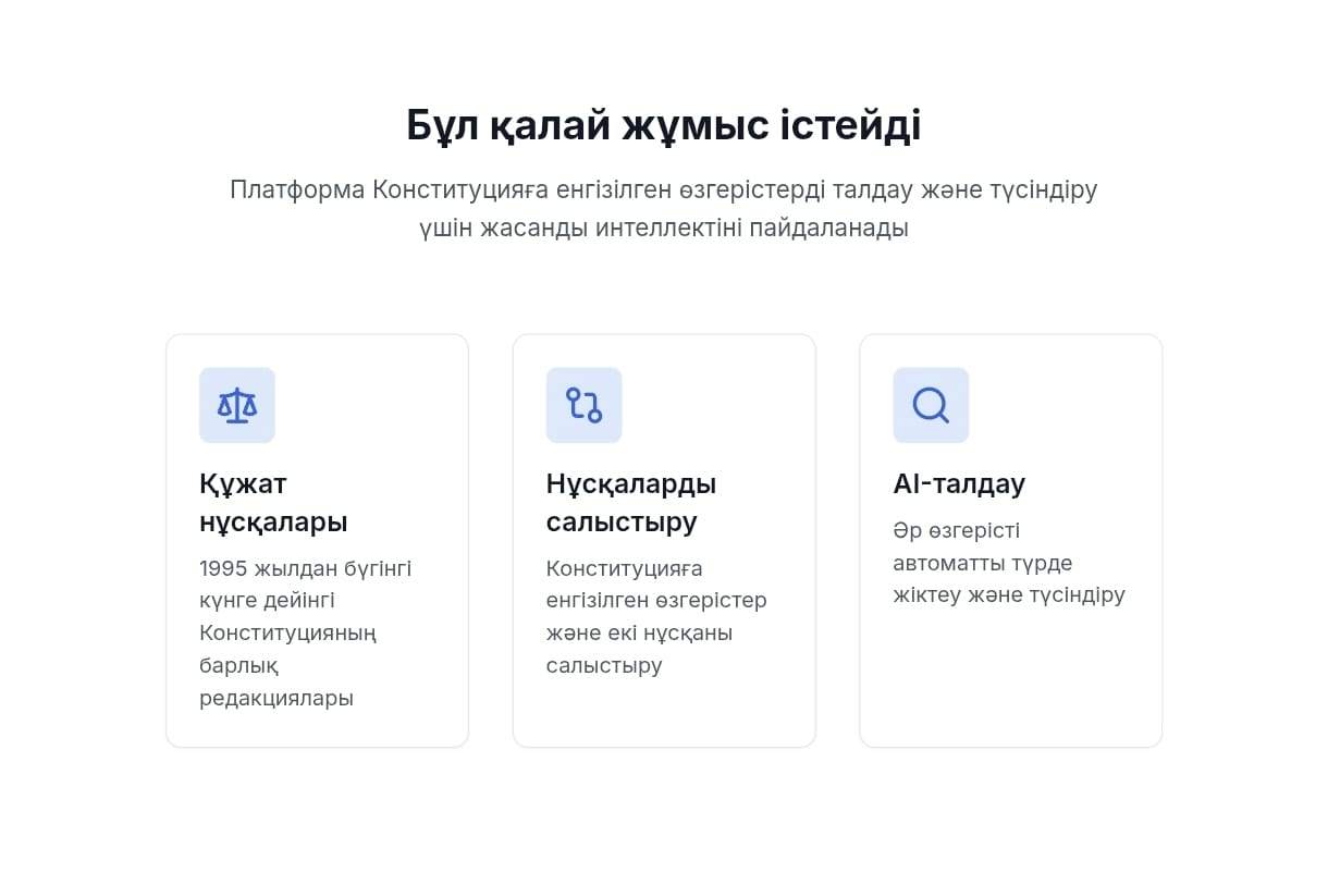 Платформа енгізілген түзетулерді талдау және оларды ұғынықты етіп түсіндіру үшін жасанды интеллект технологияларын пайдаланады. Нақты уақыт режимінде әрбір азамат еркін түрде сұрақ қойып, баптардағы нақты өзгерістерді көріп, олардың мазмұнына қатысты жан-жақты түсіндірме ала алады.