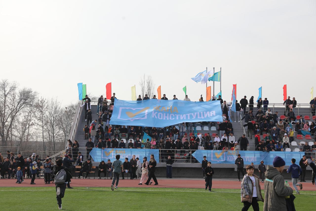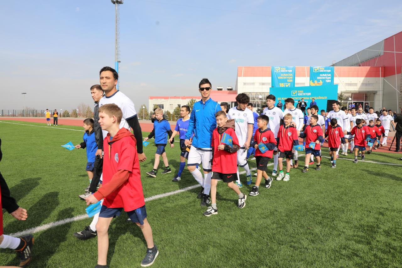 Первую команду представляли знаменитые артисты, а вторую – известные в стране спортсмены от Алматинской области. Символично то, что дата проведения референдума красовалась на экипировке футболистов, а лейтмотив зрелищного спортивно-культурного мероприятия звучал так: «Біз жаңа Конституцияны қолдаймыз!» («Мы поддерживаем новую Конституцию!»).