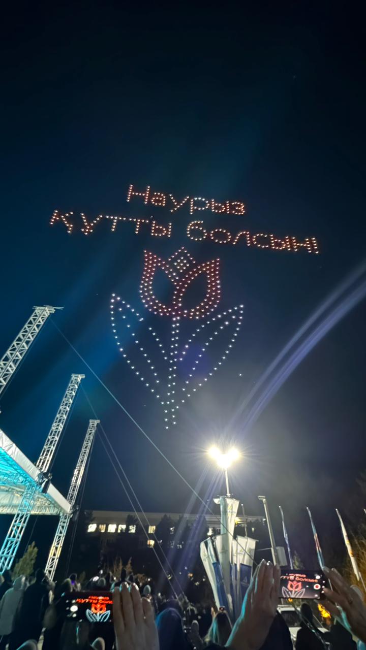 Вечером, в небе над площадью появились более 500 дронов, выстраивавшихся в различные фигуры и световые композиции. Одна за другой сменялись надпись «референдум», «Жаңа Конституция», географический контур Казахстана, поздравление с наступающим Наурызом, символический шанырак и, конечно же, восходящее солнце над волнами с подписью «Алматы облысы». Высокотехнологичное представление привлекло тысячи зрителей - горожане пришли на площадь семьями, чтобы вместе насладиться необычным зрелищем.