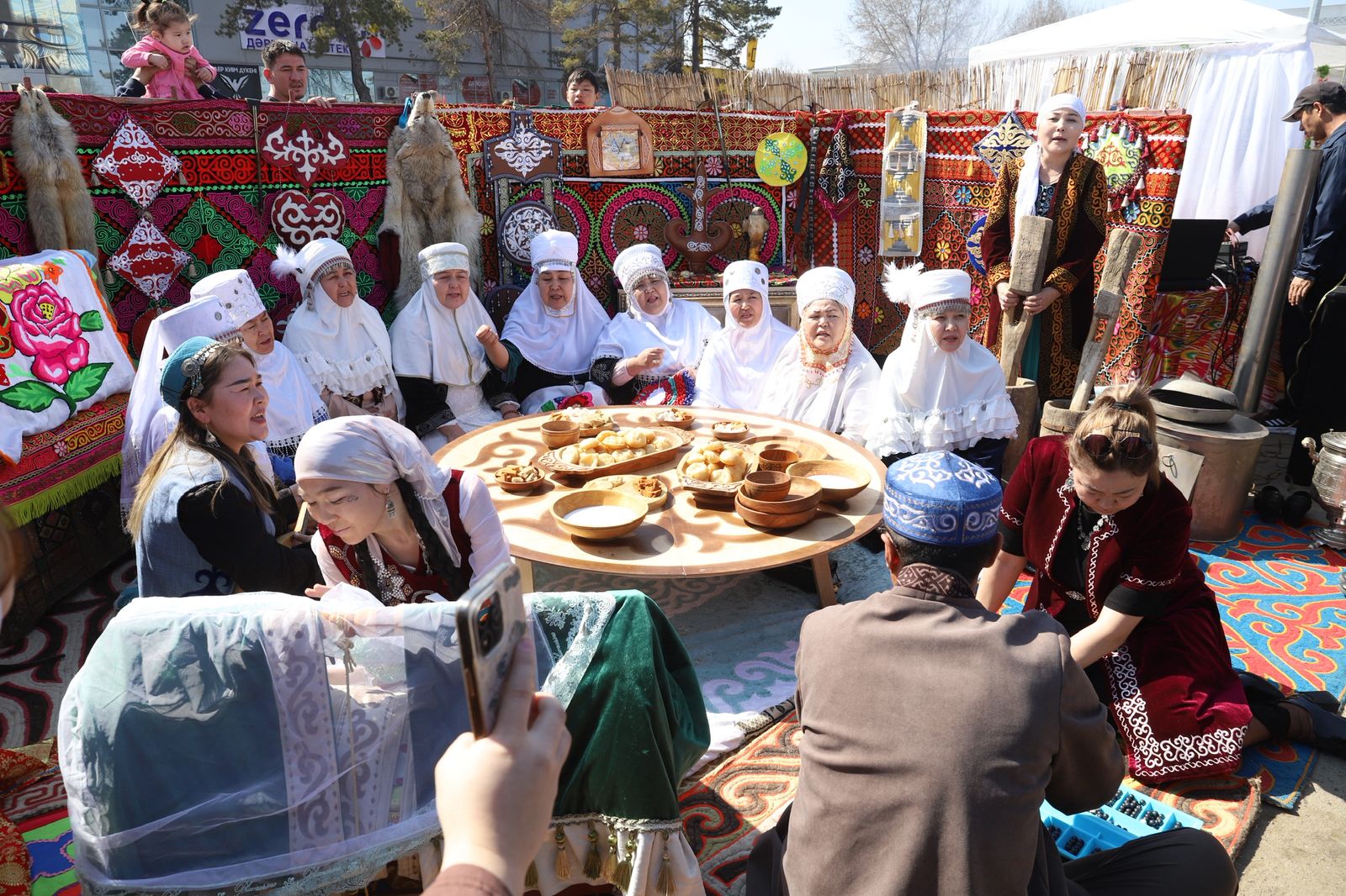 На площади установили десятки юрт, где всех желающих угощали наурыз коже, сладостями. Была организована выставка работ местных мастеров изделий казахского прикладного искусства.