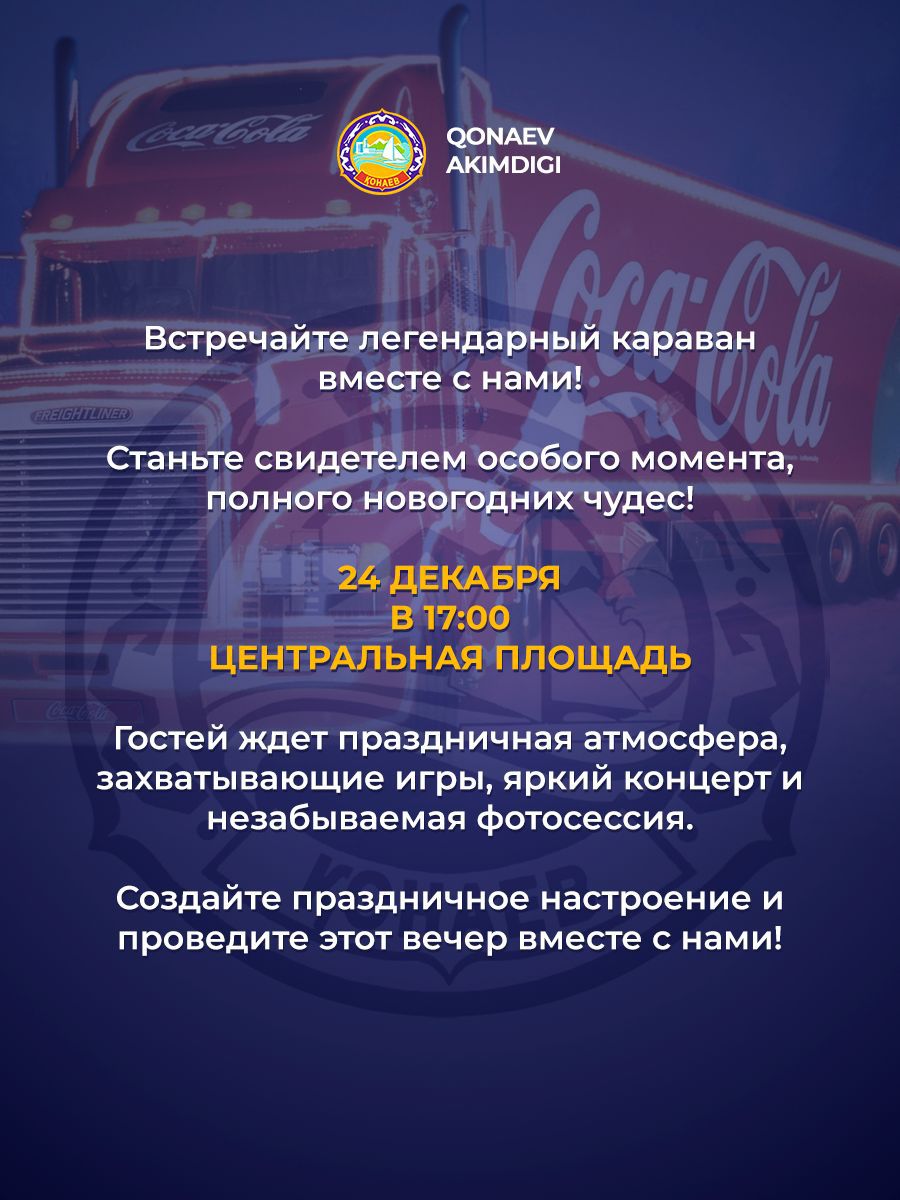 24 декабря в 16:00 часов караван Coca-Cola выедет в город Конаев по Кульджинскому тракту. Ориентировочно в 17:00 он прибудет в областной центр. Караван проедет по улицам Алматинская, Сейфуллина, Жамбыла и Конаева, после чего остановится на центральной площади.