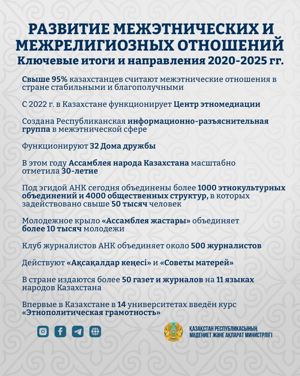 Министерство культуры и информации Республики Казахстан продолжает системную работу по укреплению общественного согласия, гражданского единства и развитию межэтнических отношений.Сегодня в мире и согласии в стране проживают представители более ста этносов, объединенные общей целью построения Справедливого Казахстана – государства равных возможностей и устойчивого развития.Выстроена эффективная система реализации государственной политики по укреплению межэтнического согласия – от центральных институтов до региональных ассамблей.Проводятся регулярные исследования и мониторинговые выезды в регион...