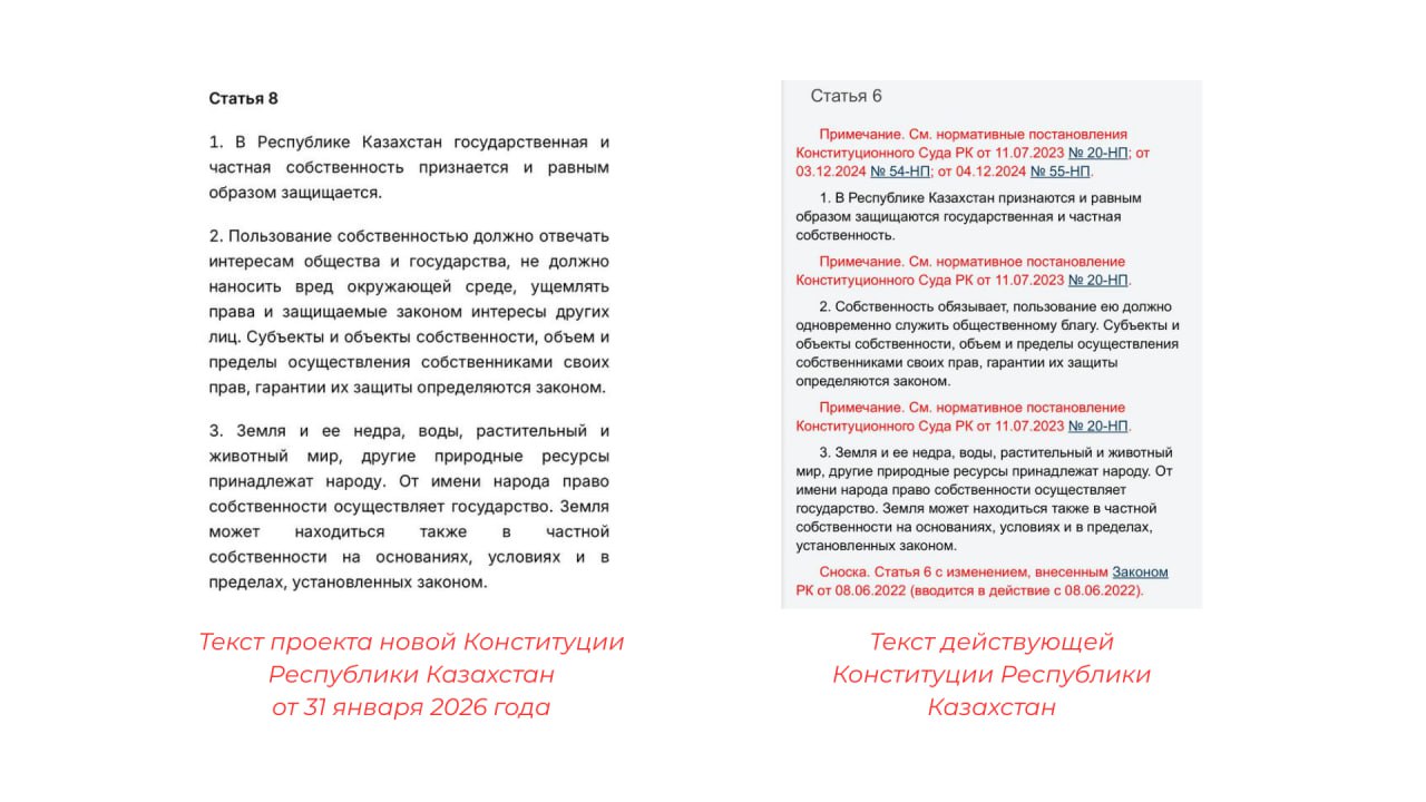 Центром по борьбе с дезинформацией фиксируется распространение ложной информации о том, что якобы в тексте проекта новой Конституции Республики Казахстан отменен запрет на продажу земель иностранцам.Центр заявляет, что данная информация не соответствует действительности и является искажением фактов.Согласно статье 6 пункту 3 действующей (https://adilet.zan.kz/rus/docs/K950001000_) Конституции Республики Казахстан, формулировка в отношении «земли и ее недр, вод, растительного и животного мира, а также других природных ресурсов» является идентичной проекту новой (https://www.gov.kz/memleket/enti...
