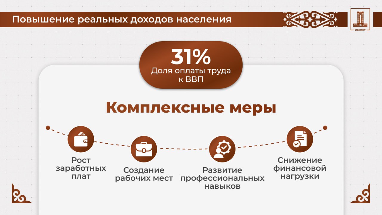 На расширенном заседании Правительства под председательством Президента Республики Казахстан Касым-Жомарта Токаева Премьер-министр Олжас Бектенов доложил о проводимой работе по обеспечению роста доходов населения.Отмечено, что рост уровня доходов граждан не успевает за темпами роста экономики. Доля заработной платы в валовом внутреннем продукте составляет 31%, что является высоким показателем для Центральной Азии. Цель – достичь уровня развитых стран от 40% и выше.Темпы роста заработных плат отстают от динамики прибыли бизнеса, полученной как самостоятельно, так и за счет поддержки государств...