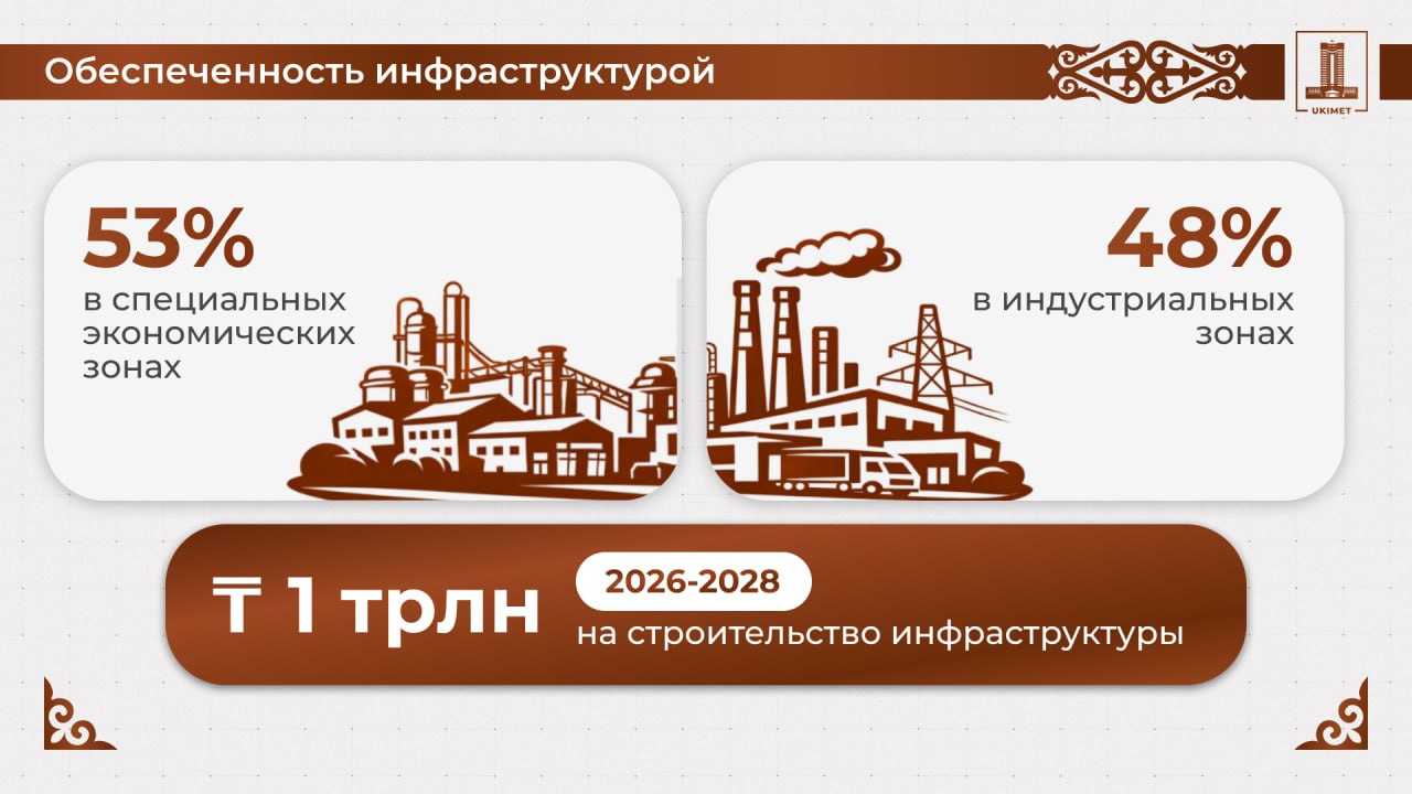 Олжас Бектенов на расширенном заседании Правительства под председательством Президента Республики Казахстан Касым-Жомарта Токаева отметил, что набранные темпы роста экономики требуют опережающего развития инфраструктуры.Вместе с тем, в специальных экономических зонах средняя обеспеченность инфраструктурой составляет лишь 53%, в индустриальных зонах – 48%.В связи с этим Правительством принимается ряд мер по ускоренному развитию инфраструктуры в СЭЗ и ИЗ.Приняты необходимые решения для 100% обеспечения СЭЗ и ИЗ инфраструктурой.В течение трех лет будут осуществлены залповые инвестиции в размере 1...
