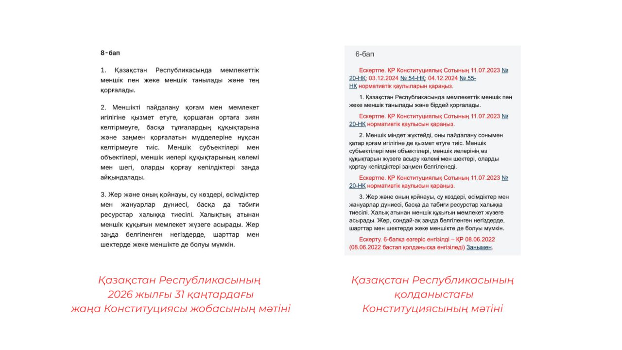 Орталық аталған ақпараттың шындыққа сәйкес келмейтінін және фактілерді бұрмалау болып табылатынын мәлімдейді.Қазақстан Республикасының қолданыстағы Конституциясының (https://adilet.zan.kz/kaz/docs/K950001000_) 6-бабы 3-тармағына сәйкес «жер жəне оның қойнауы, су көздері, өсімдіктер мен жануарлар дүниесі, басқа да табиғи ресурстар» жөніндегі тұжырым жаңа Қазақстан Республикасының Конституциясы жобасындағы (https://www.gov.kz/memleket/entities/ksrk/press/news/details/1152063?lang=kk) тұжырыммен бірдей болып табылады және қандай да бір өзгерістерге ұшыраған жоқ.Қосымша атап өтеміз, Конституциялық...