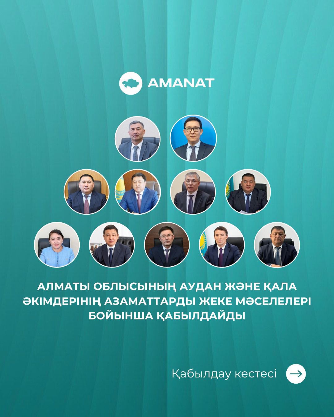 25 ақпанда AMANAT партиясының қоғамдық қабылдау бөлмелерінде Алматы облысының әкімімен қатар 2 қала және 9 аудан әкімі бір мезетте азаматтарды жеке мәселелері бойынша қабылдайды.Қабылдаулар өңірдің барлық аумағын қамтиды және бекітілген кестеге сәйкес өтеді.Қабылдау өткізетін әкімдер:• Марат Сұлтанғазиев – Алматы облысының әкімі (25 ақпан, 15:00)• Асхат Бердіханов – Қонаев қаласының әкімі (25 ақпан, 10:00, облыстық филиал)• Аркен Өтенов – Алатау қаласының әкімі (25 ақпан, 15:00, аудандық филиалы)• Азат Құтпанбетов – Балқаш ауданының әкімі (25 ақпан, 11:00 аудандық филиалы)• Талғ...