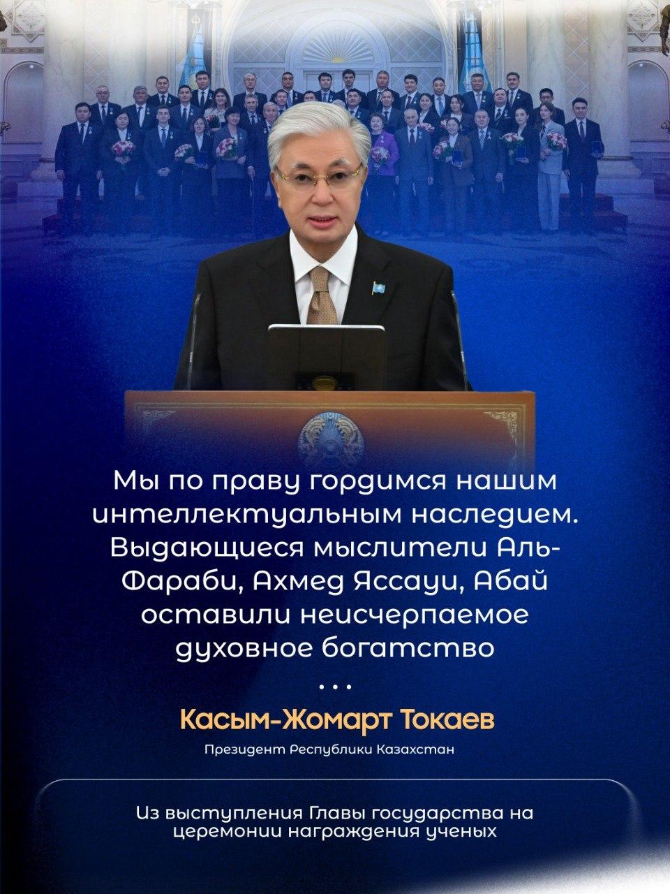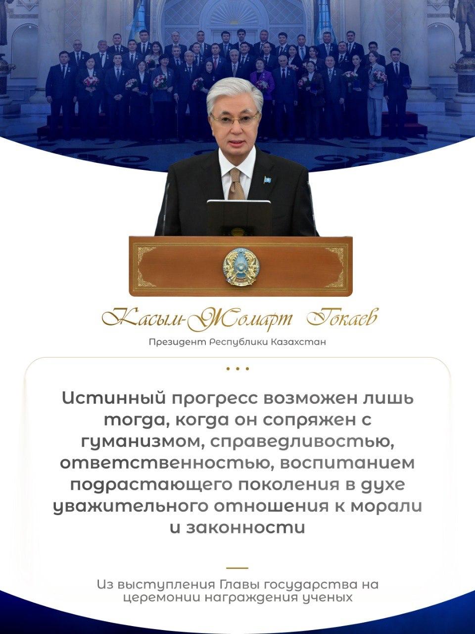Во время выступления на церемонии награждения ученых Глава государства подчеркнул, что именно научный потенциал становится ключевым показателем конкурентоспособности страны и ее авторитета на международной арене. При этом страны, которые развивают знания и науку, становятся лидерами мирового развития.Президент, процитировав Абая, также подчеркнул, что формирование интеллектуальной нации требует не только знаний, но и постановку во главу угла таких ценностей как, ответственности, справедливость и взаимное уважение. В современных условиях ключевой задачей становится развитие науки, освоение новы...