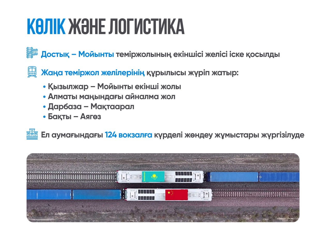 Мемлекет басшысы Қазақстанның көлік-логистика әлеуетін кеңейтіп, елімізді Еуразиядағы ірі транзит хабына айналдыруға жіті мән береді.2025 жылы 13 мың шақырым автокөлік жолын салу және жөндеу жұмыстары басталды. Жаңа жолдардың ұзындығы – 1,9 мың шақырым.Стратегиялық тұрғыдан маңызды күрежолдар қатарында Орталық – Батыс автомагистралы, Қарағанды – Жезқазған, Ақтөбе – Ұлғайсын, Атырау – Доссор учаскелері бар.Мемлекет басшысының тапсырмасымен Зайсан, Катонқарағай және Кендірліде үш жаңа әуежай құрылысы басталды. Арқалық әуежайын қалпына келтіру жұмыстары қолға алынды.Президент әуе арқылы жүк тасы...