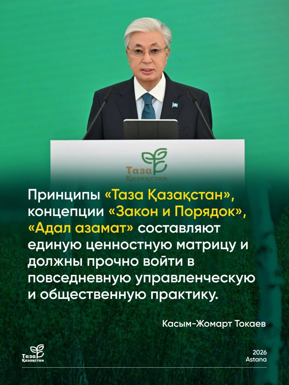Мемлекет басшысы тазалық ұғымына қазақ қоғамында әрқашан ерекше мән берілгенін, ол кең мағынада, соның ішінде таза ақыл, таза ар-ұждан және таза жүрек ретінде пайдаланылатынын атап өтті.Ежелгі заманнан бері ата-бабаларымыз табиғатпен үйлесімді өмір сүріп, оны қорғауды қасиетті парыз деп санаған. Бүгінде «Таза Қазақстан» тазалықтың ұлттық бірегейліктің ажырамас бөлігіне және қазіргі Қазақстанның негізгі құндылығына айналып келе жатқанын көрнекі растайды.Миллиондаған немқұрайлы емес азаматтардың қайсар еңбегінің арқасында жоба шынымен де бүкілхалықтық қозғалысқа айналды және «Заң және Тәртіп» жә...