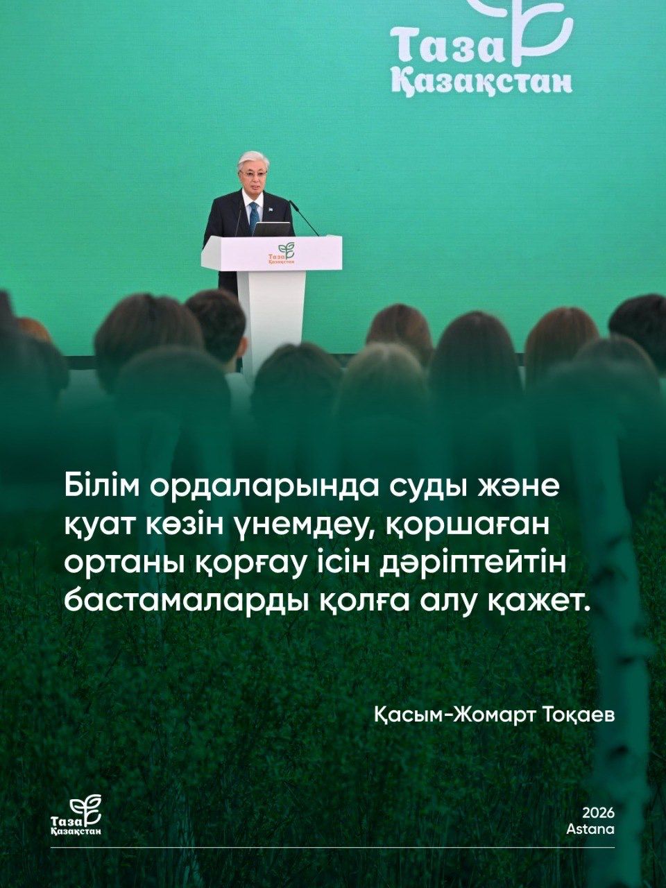 Президент сондай-ақ экологиялық қауіпсіздік қазір ұлттық қауіпсіздік деңгейіне көтеріліп жатқанын түсіндірді. Қазақстан бұл саладағы халықаралық бастамаларды белсенді түрде ілгерілетуде, соның ішінде Астанада БҰҰ демеушілігімен Өңірлік экологиялық саммитті өткізді.