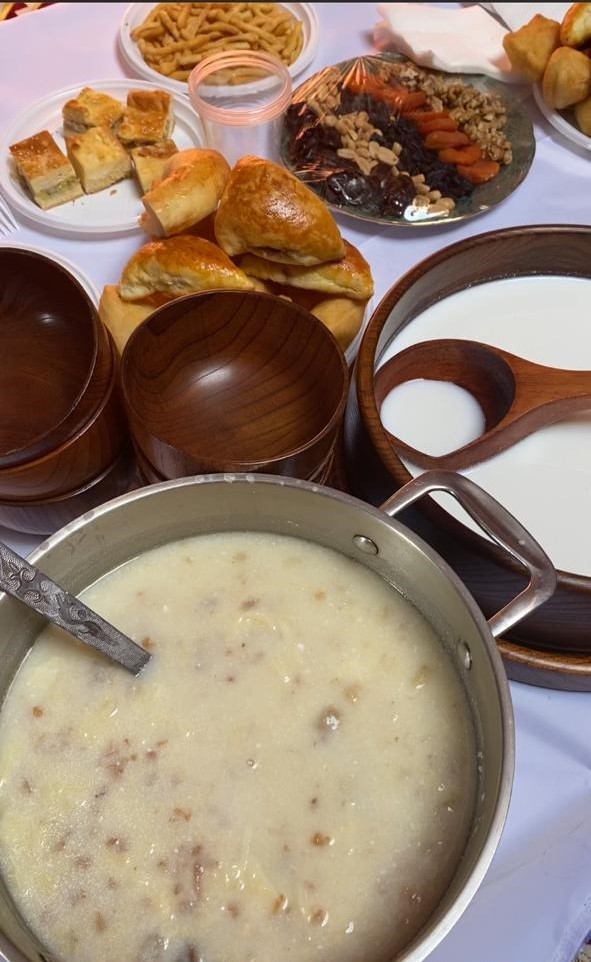 Наурыз көже – национальное блюдо, приготовление которого является важнейшей частью ритуалов празднования месяца, знаменующего начало нового года. Сакральным является количество ингредиентов – их семь, оно состоит из большого количества различных круп и копченой или вяленой конины. Раньше из оставшихся костей кипятили в большом котле бульон до появления на поверхности костного мозга. Эту смесь тщательно перемешивали и готовили напиток – томыртка. В мясной бульон добавляли разные виды курта и поили им детей и стариков. Он считался особо питательным и полезным для здоровья. И, конечно, как же без жареных баурсаков, сладостей, кумыса и других напитков?
