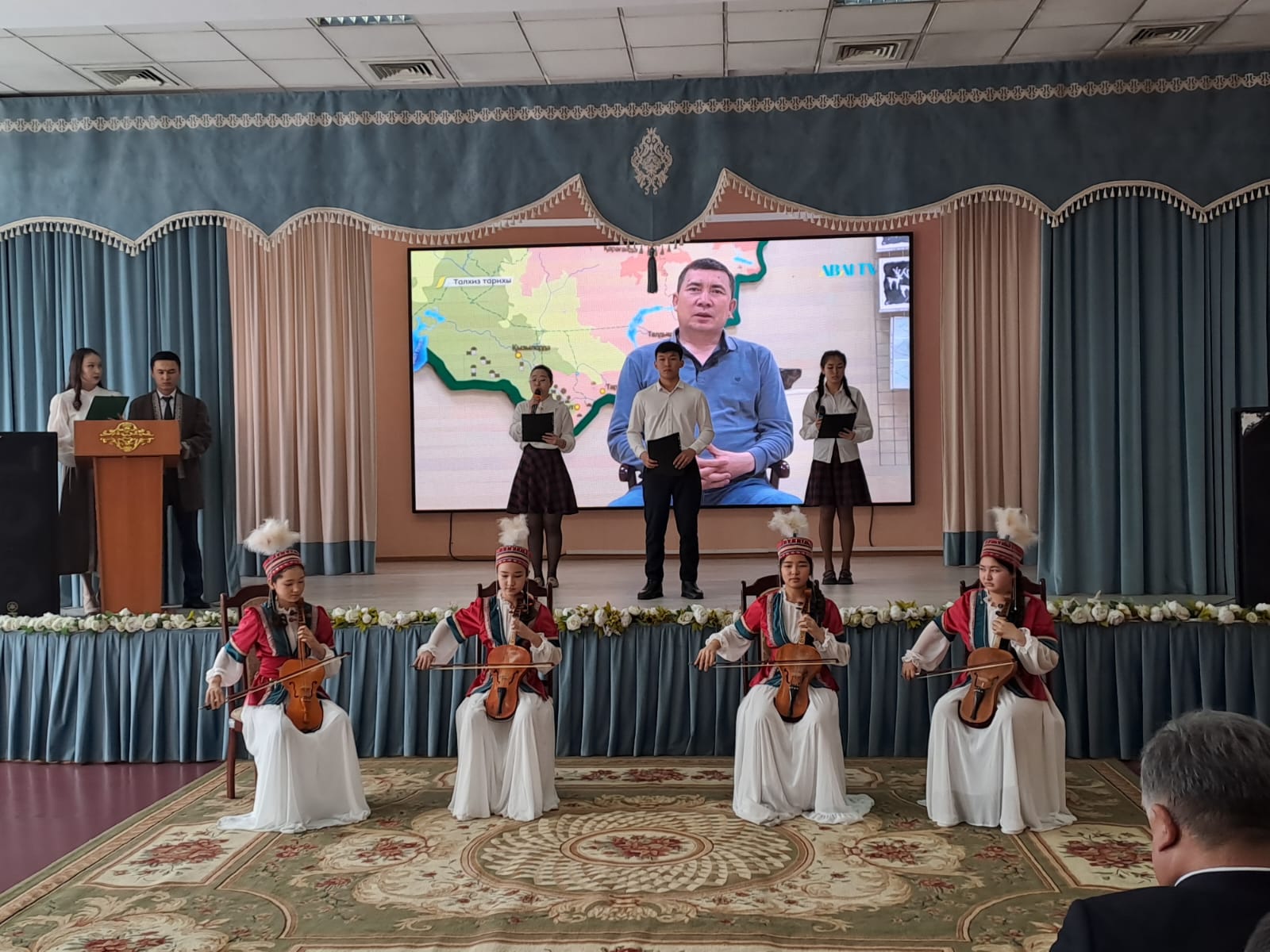 Открытие выставки по традиции отметили разрезанием красной ленты и непременным шашу. Почетную миссию выполнили секретарь районного маслихата Мухит Алибеков и археолог Ералы Ахимбек. Музыкальную часть торжества поддержал этнографический ансамбль «Талхиз Сарыны» из Дома культуры села Бесагаш. Кобыз, домбра, народные инструменты - все это создавало атмосферу зазвучавшей в музыке истории. В концертной программе ученики школы-гимназии №25 представили сценические постановки об истории древнего Талхиза, а учащиеся школы-лицея №7 – вокальные и инструментальные композиции, стихи.
