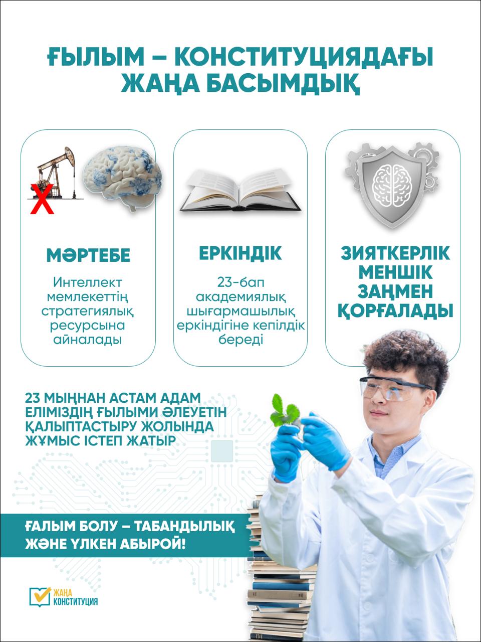 Жаңа Конституция жобасында білім, ғылым және инновацияларға айрықша мән берілді. Преамбулада бұл салалар ел дамуының басты құндылықтары ретінде айқындалды.Осылайша ғылым мен білім мемлекеттің стратегиялық басымдықтары қатарына енгізіліп, жаңа даму деңгейіне көтерілмек.Құжатта 23-бабтың 1-тармағында ғылыми және техникалық шығармашылық еркіндікке кепілдік беріліп, оларды қорғаудың құқықтық негізі қаланады.Бұл норма білім беру мен ғылыми дамудың берік іргетасын қалыптастырып, адами капиталды нығайтуға бағытталған.